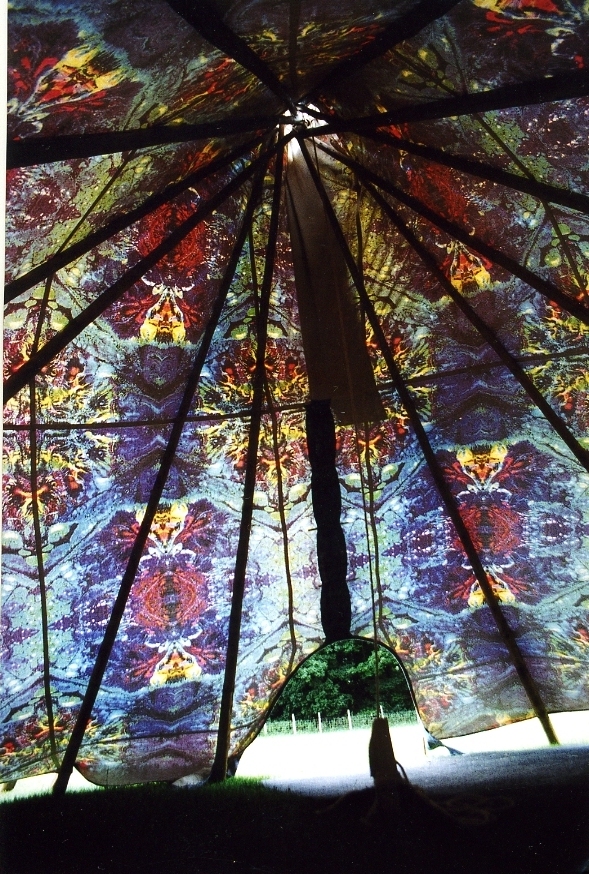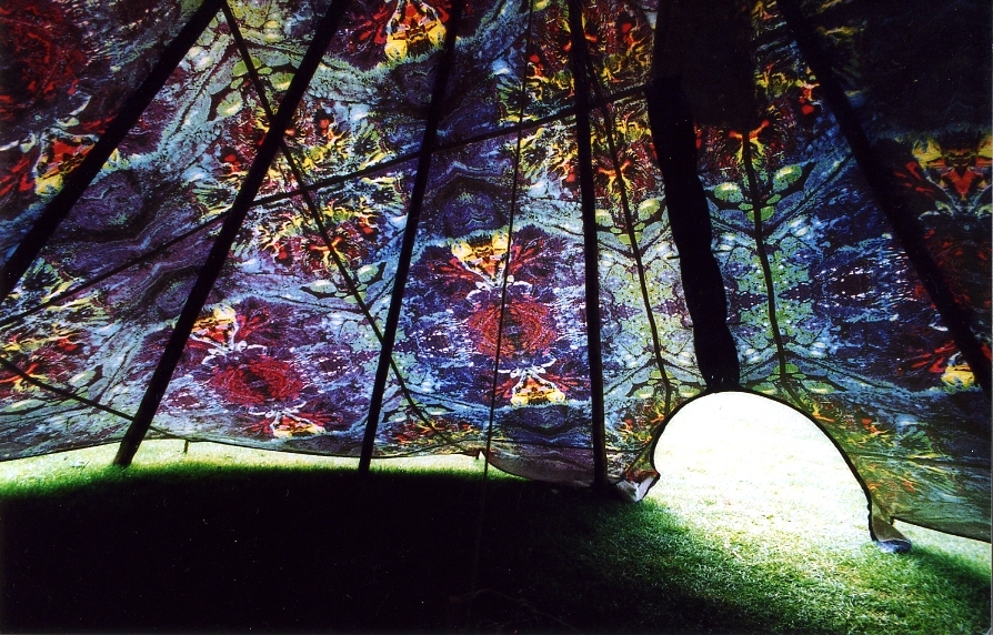 The Blue Mantis Fabric was printed in 1995 as a deep psychedelic pattern, creating a fantasy world to disappear into. The Tipi form, gave the pattern gravity anchoring it and the viewer to the ground, whilst also creating a fully immersive experience when viewed from the inside. Looking up added to this experience as the Tipi creates a tunnel of psychedelic pattern accentuated by the tapering poles creating their own tunnel effect. This combination of physical anchoring and psychological freedom was the goal of this work.