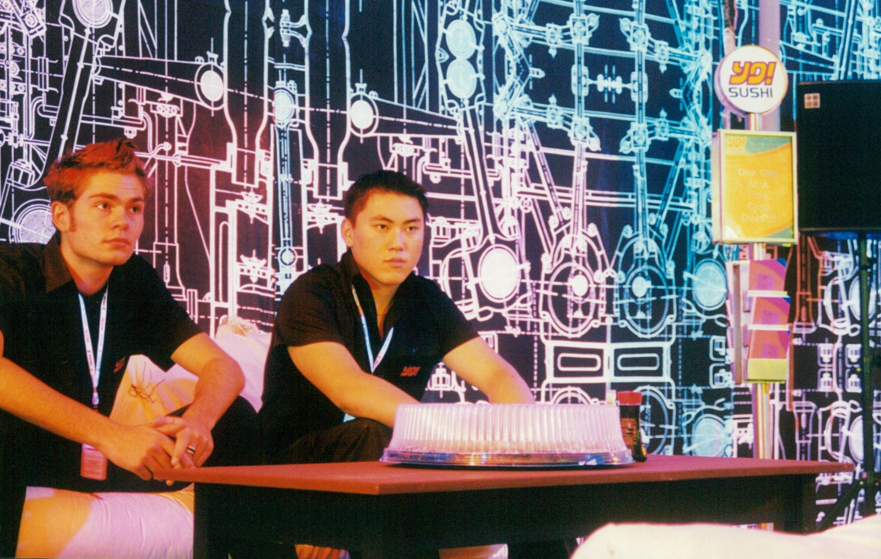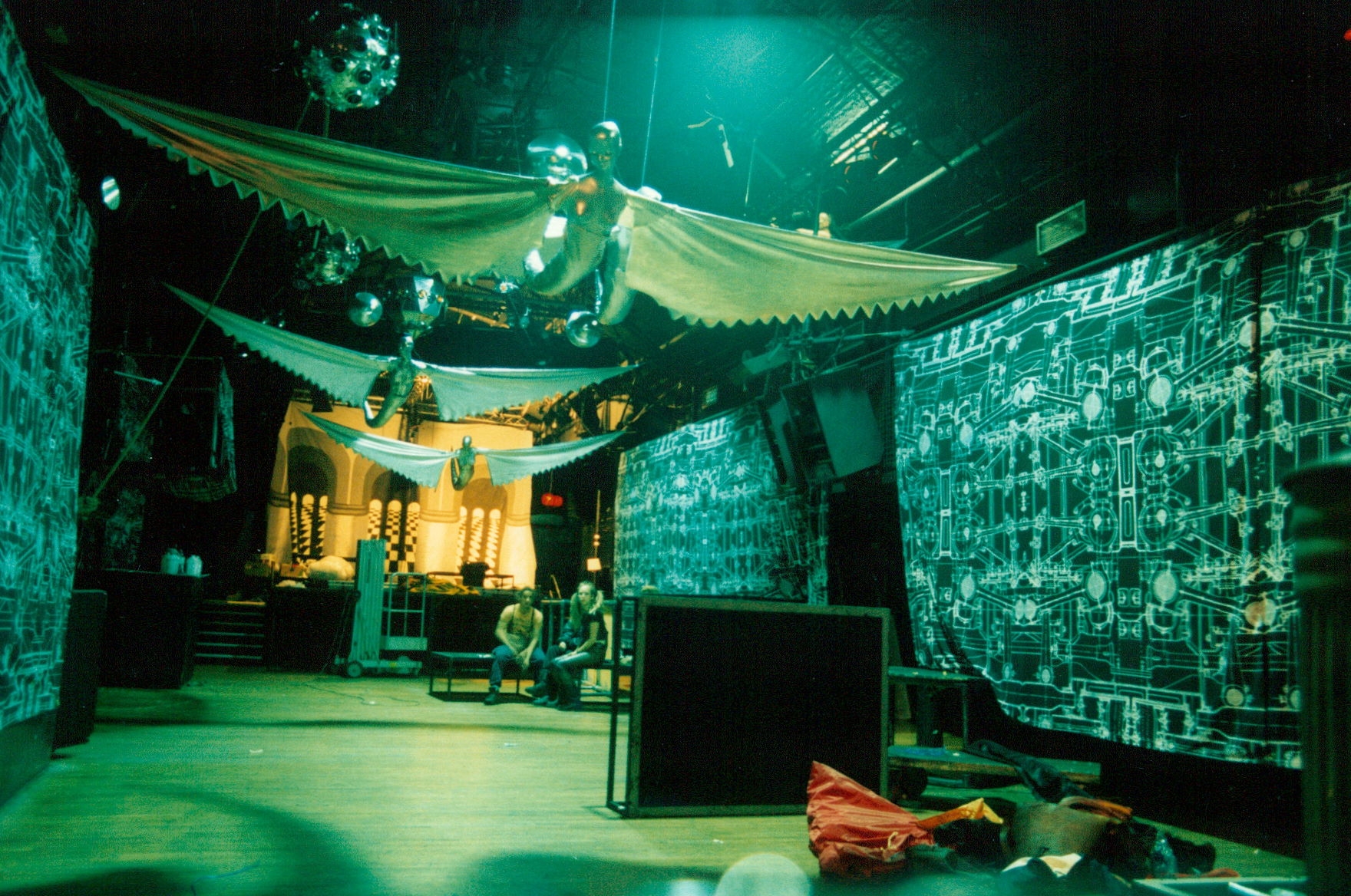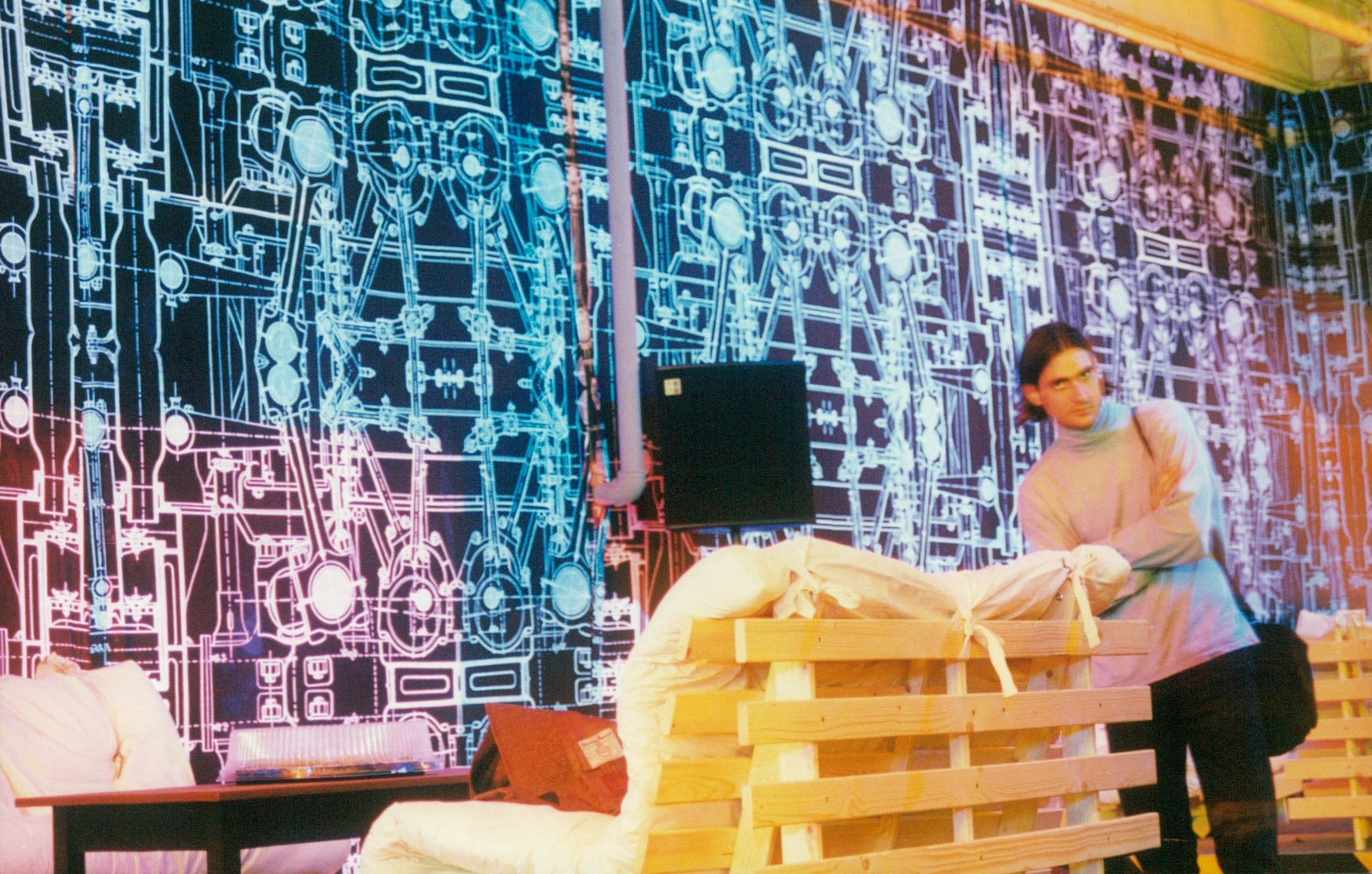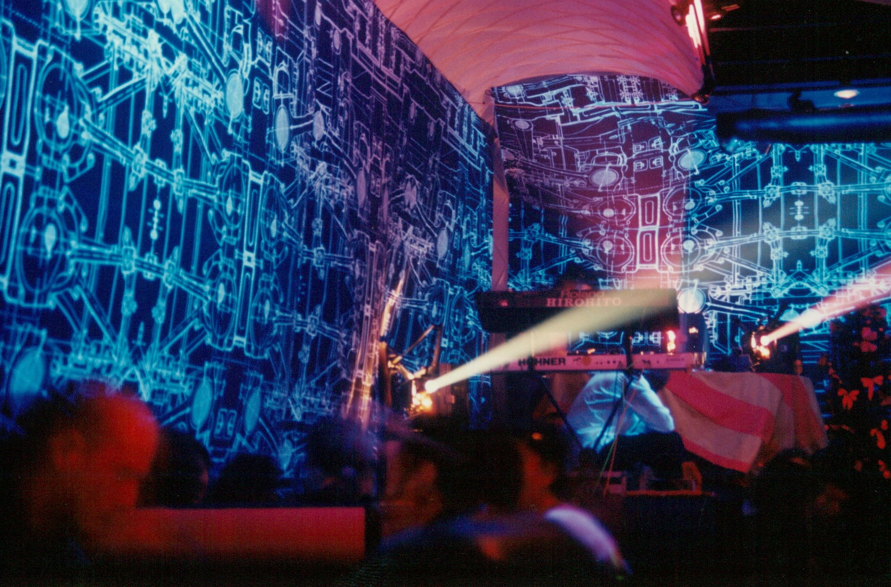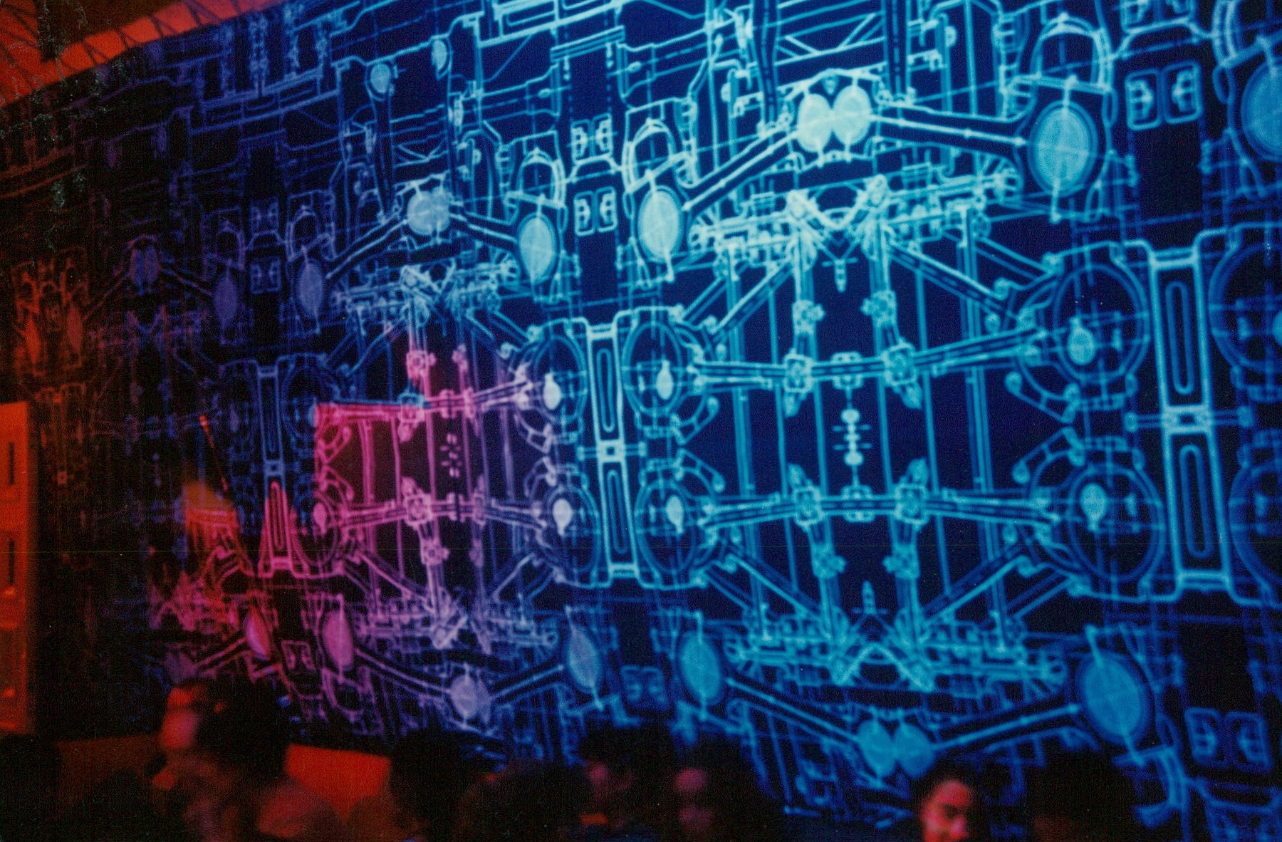The first of three commissions by Paul “Rip” Stone and Mr. C of Plink Plonk Records for the club nights Vapourspace at Turnmills and Flavour at The End. The music was experimental electronica, slower and more minimal than other dance floors, sensual, deep, interesting, and psychedelic. I always had a love of blueprints as, like x-rays, they showed the secret inner workings of things. Mysterious, and somehow glowing with a blue luminescence they also appear to have a spiritual dimension. Plink Plonk carried artists whose music was also stripped back and had a mystery to it but it also had a deep, sensual, driving force to it, and this ‘drive’ led me to ‘engines’ and more specifically to drive shafts and pistons which have a sexual dimension. The combination of blueprints, pistons, and mirroring, created a stripped back psychedelia that had strength and movement and worked well on dance floors, as well as in chill out rooms.