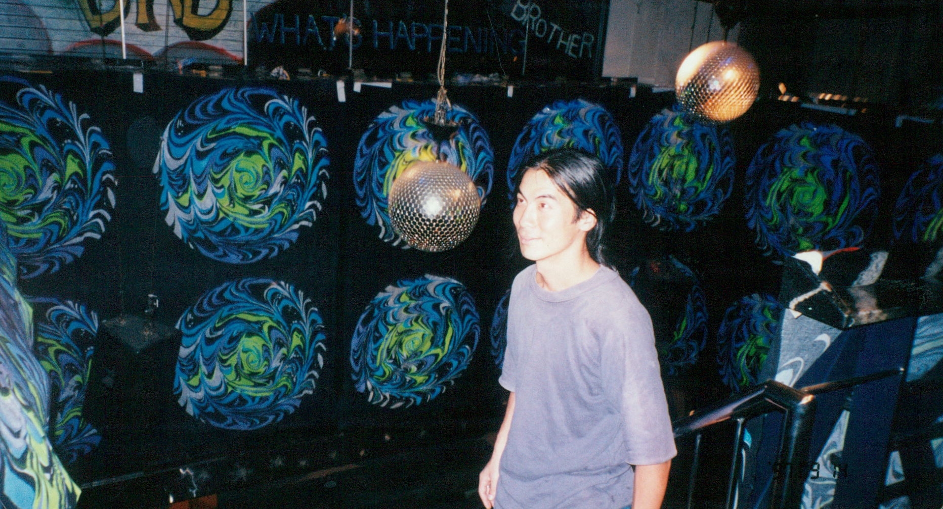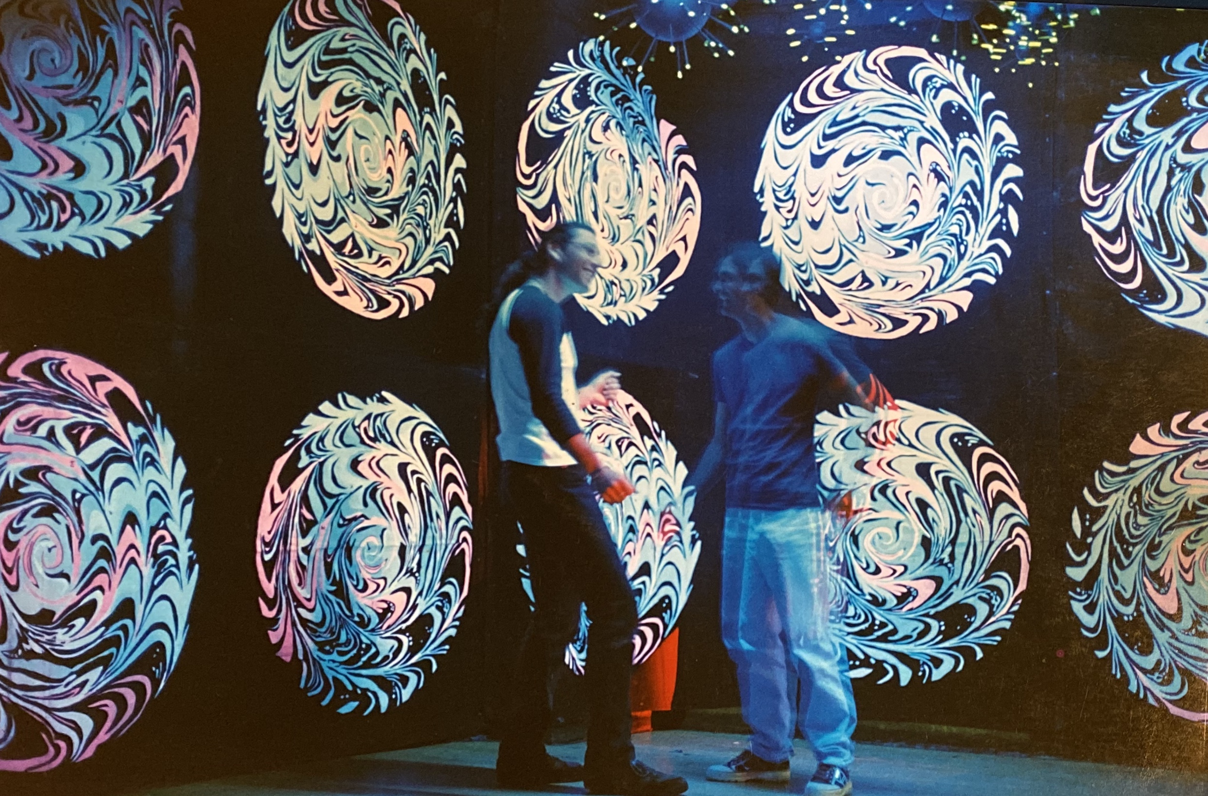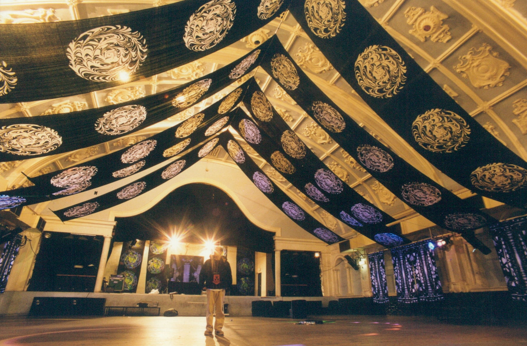 Created for small spaces in London night clubs this spiral, spinning disk design was created to add movement in two planes; the plane of the surface and a three dimensional tunnel. They worked individually and in large numbers as their ‘movement’ prevented them from looking like a static repeat. I made a colour and black and white version. Printed in Delhi, they were used by Return to the Source in London, Rainbow 2000 in Tokyo, Crash in Vauxhall, a huge rave outside Melbourne and many other nights.