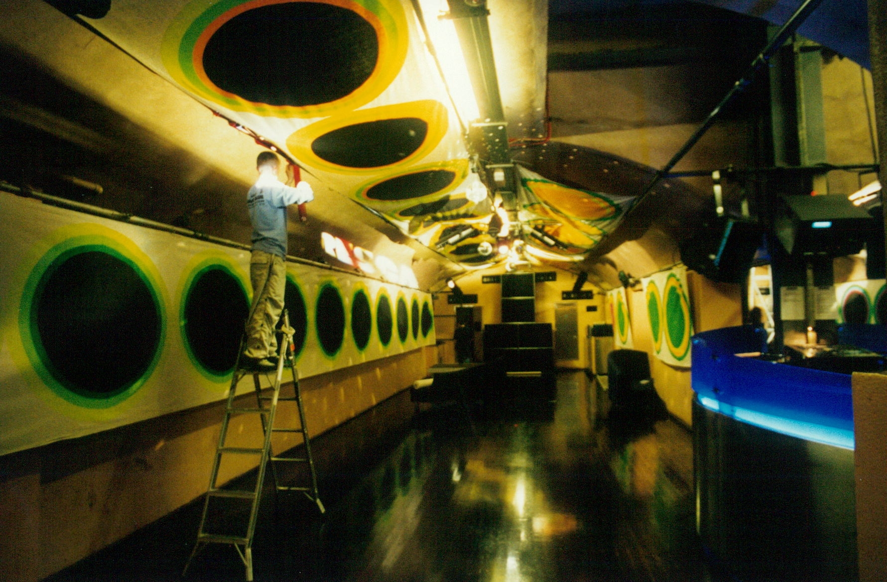 Although ‘The Small Targets’ were close in form to the ‘The Targets’ (see Pop Printing) they had a more serious and urban feel. ’The Targets’ were big hearted, but these had the feeling of ‘getting down to business’. They were picked up by the Techno promotors as they had a simple stripped back feel but were interesting, and I printed variations in matching colour ways that I would be used all together. They were used at The End nightclub in The West End and club nights in Brixton.