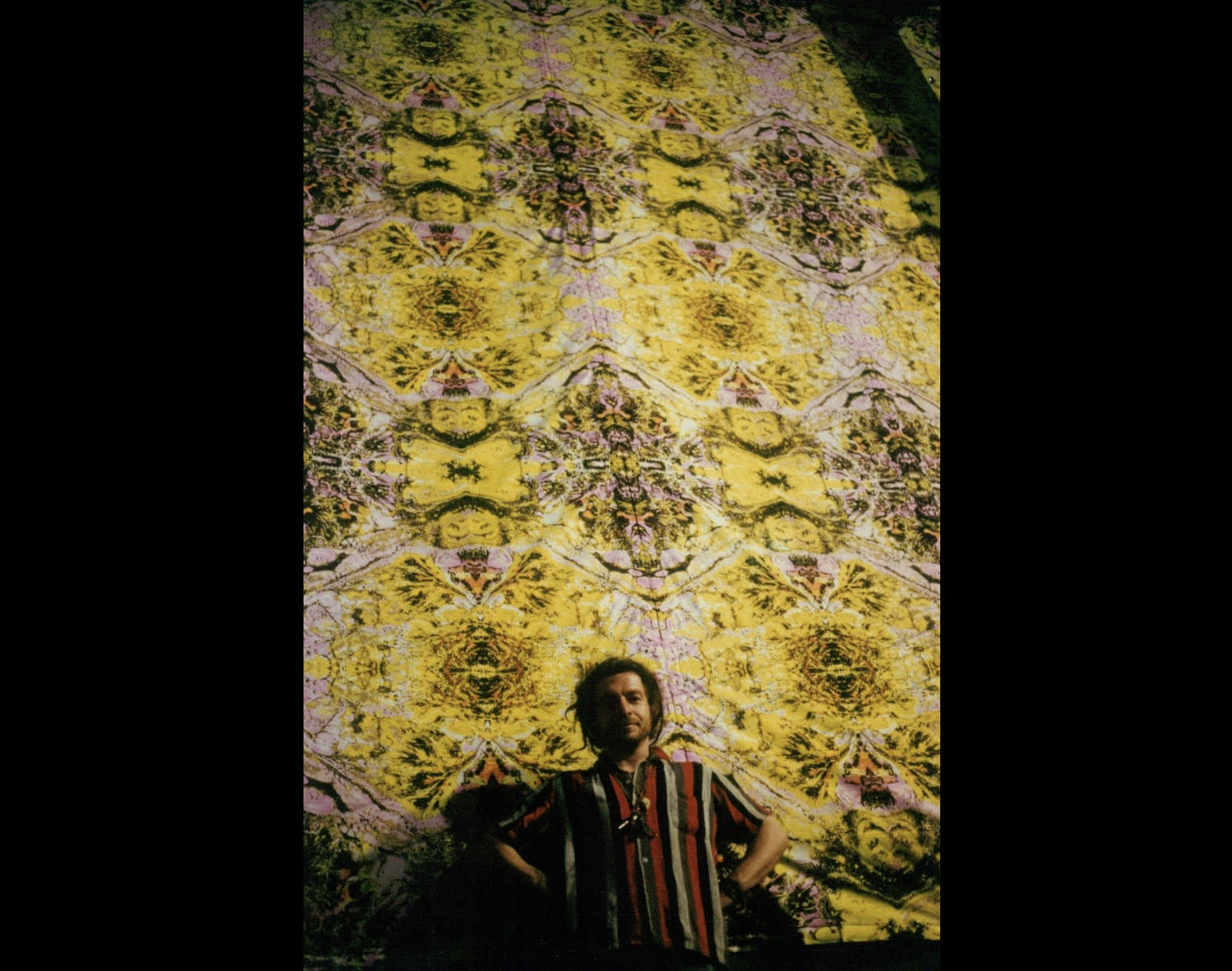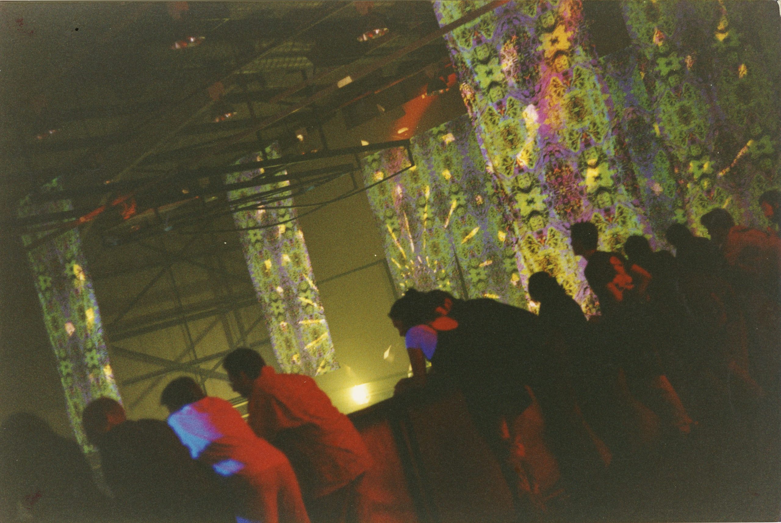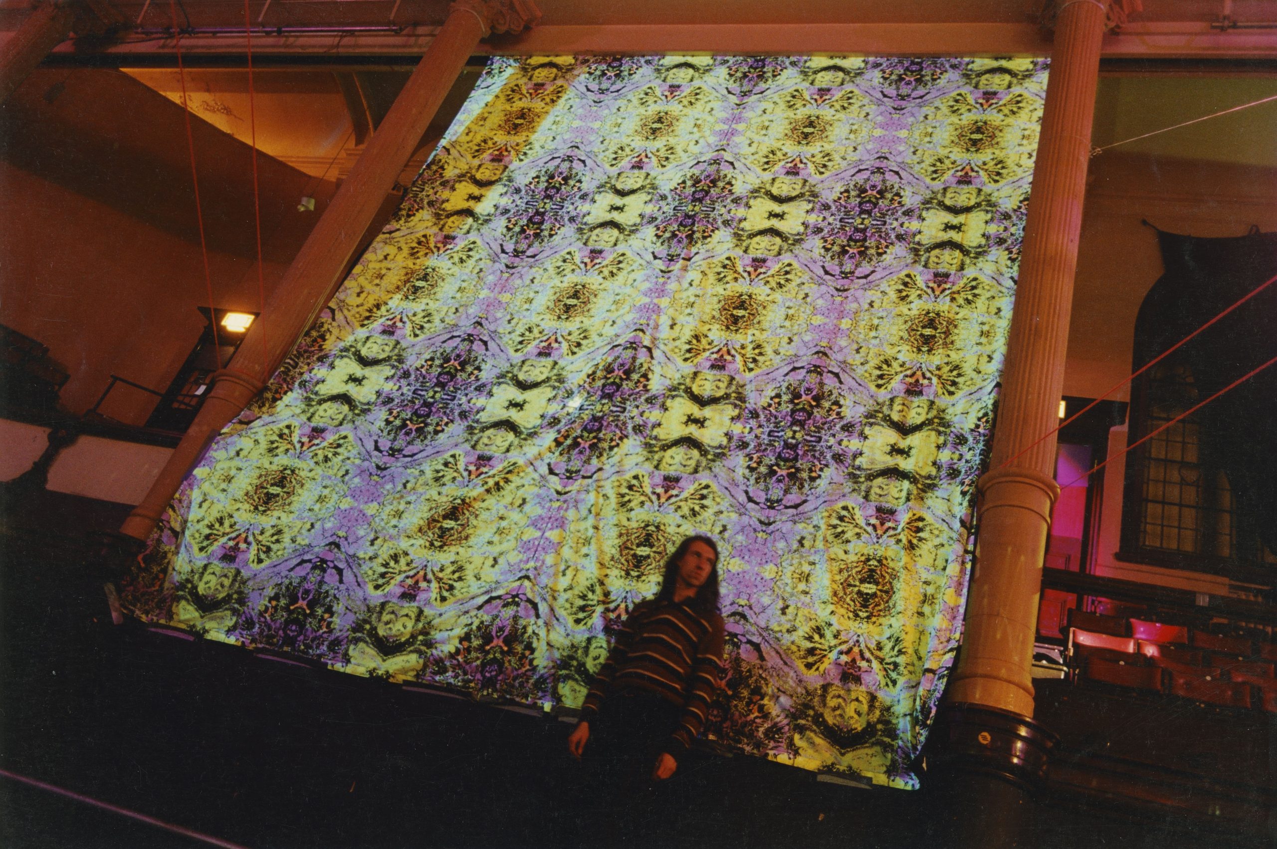 First shown at The Burning Man festival in 1994 when there was a separate camp for dance music, this design had a fine, structured, psychedelic pattern that also packed a punch and worked in the daytime as well as at night. Up close, a strange alien landscape to disappear into, but used in larger areas, it takes the form of an electric grid that pushed energy back into the viewer. This pattern was heavily picked up on and was used in London, Birmingham and European clubs, as well as in the east and west coast of the USA and in Japan.