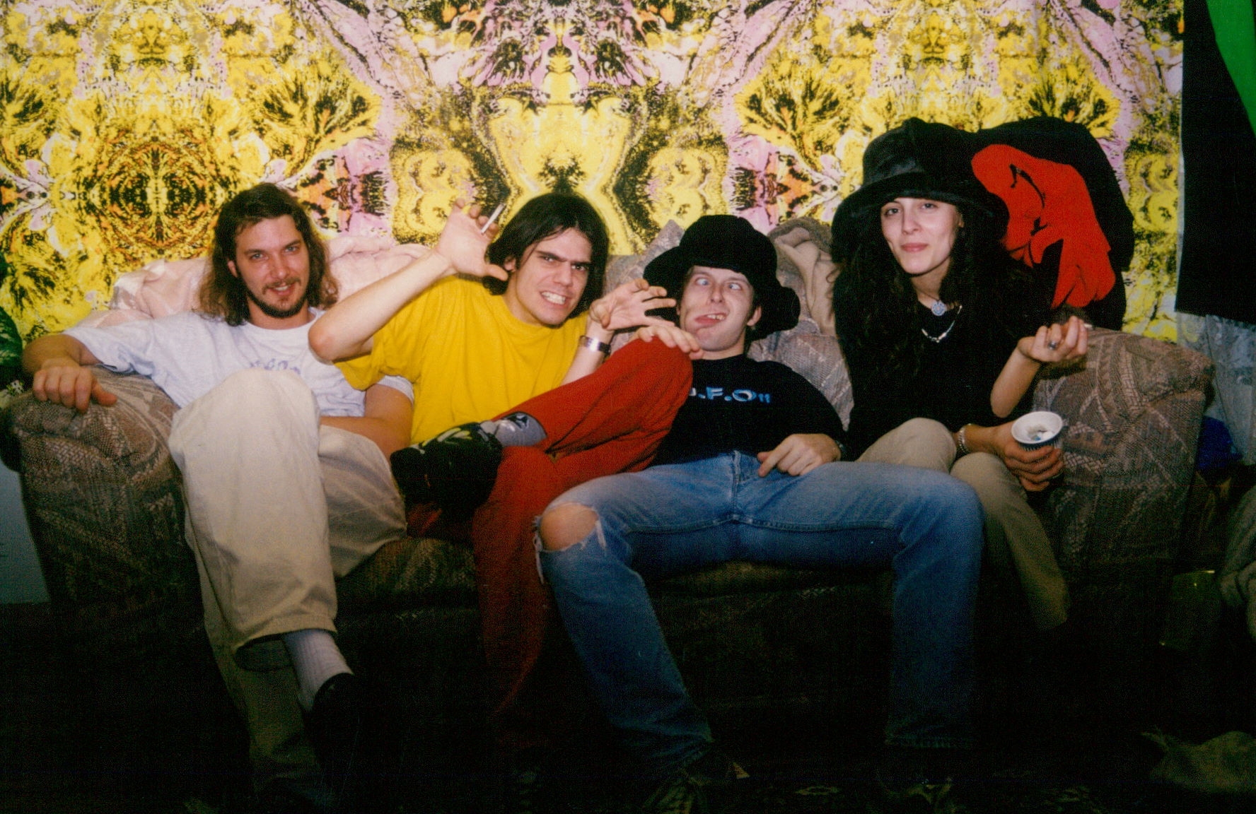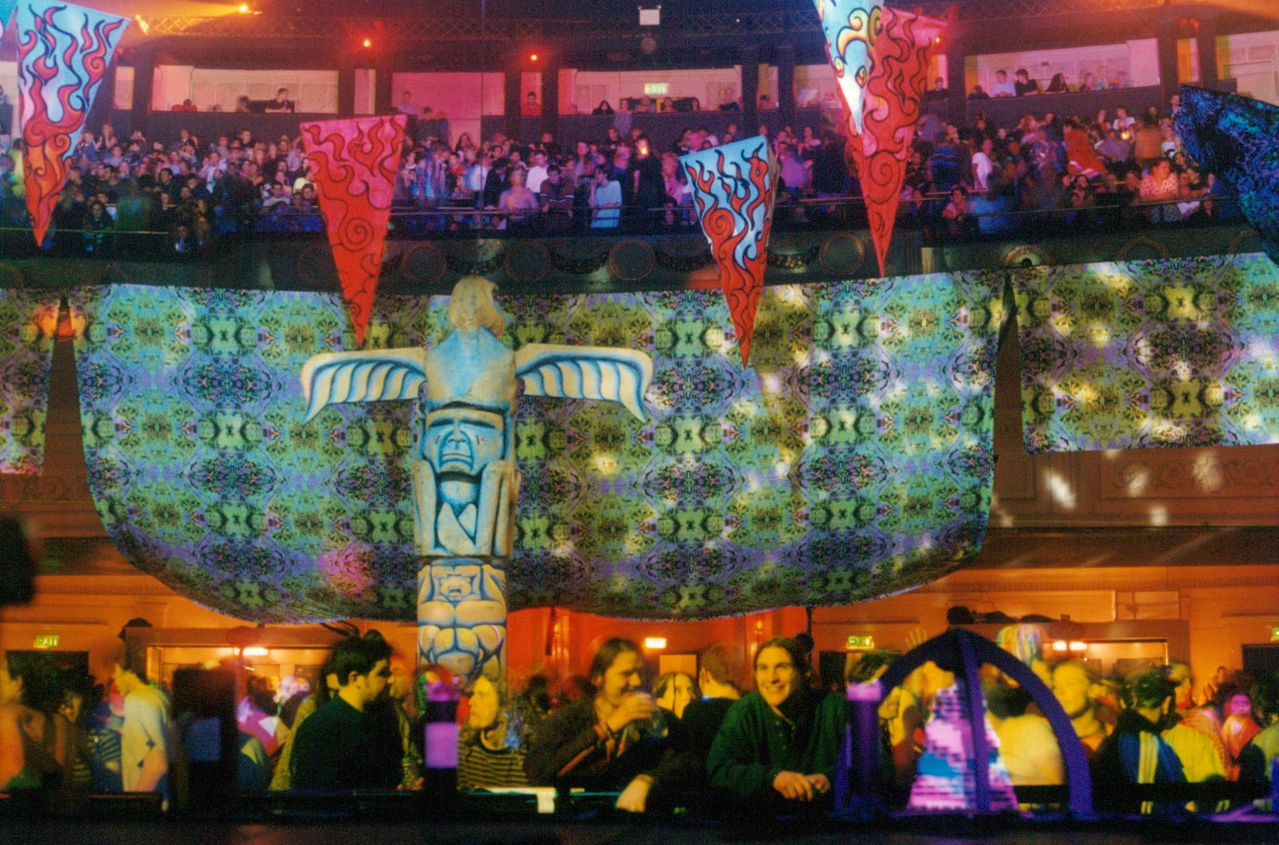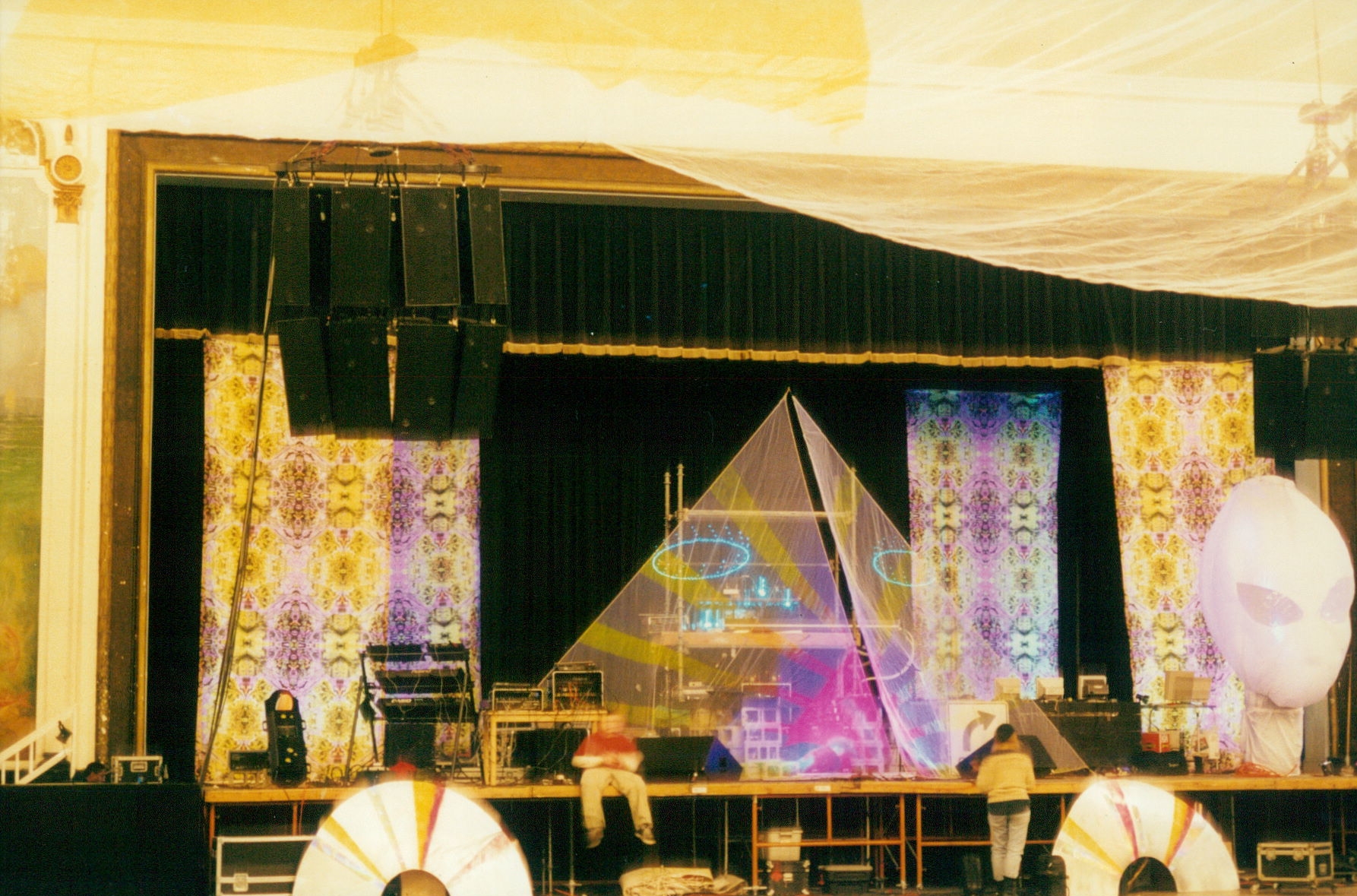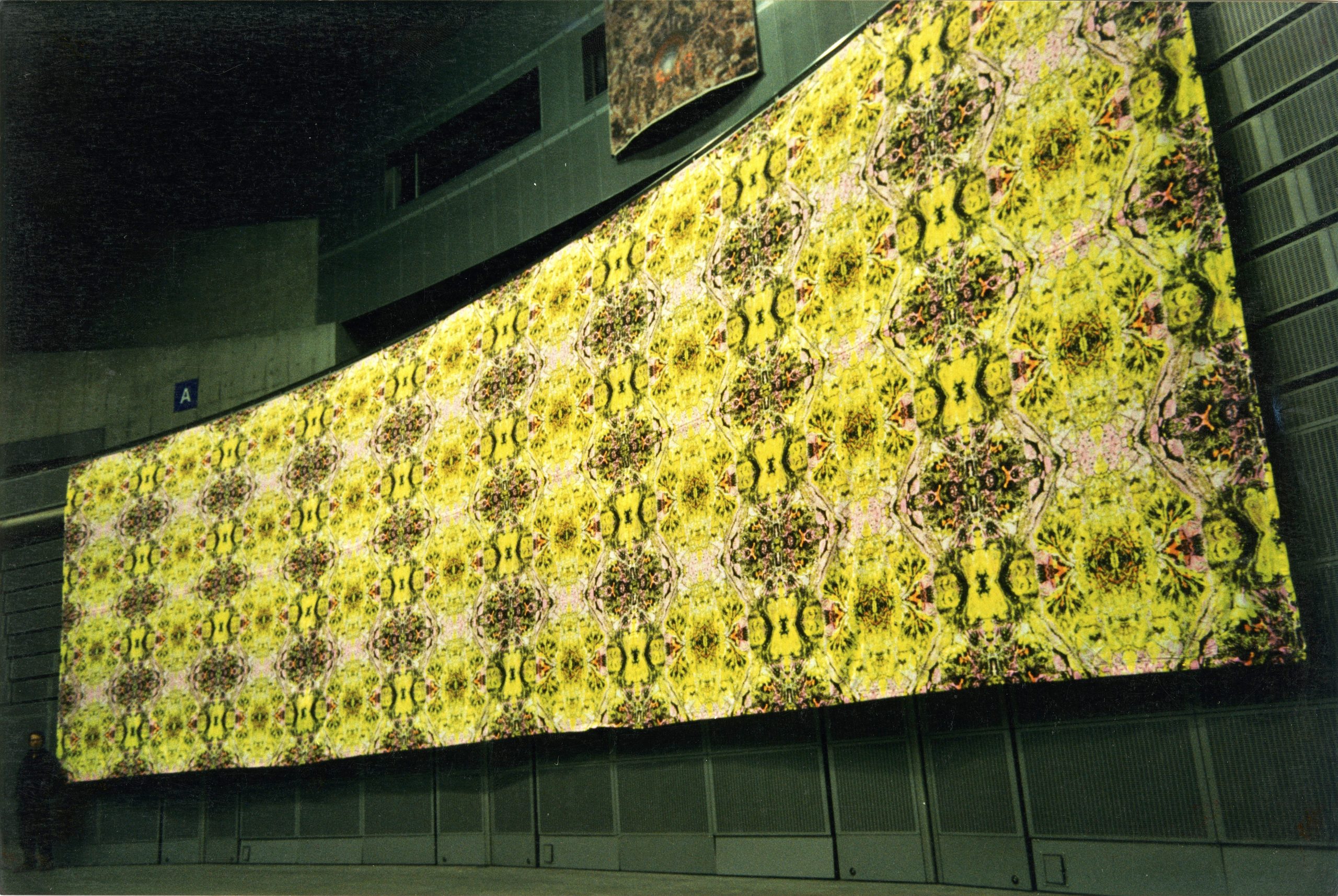 First shown at The Burning Man festival in 1994 when there was a separate camp for dance music, this design had a fine, structured, psychedelic pattern that also packed a punch and worked in the daytime as well as at night. Up close, a strange alien landscape to disappear into, but used in larger areas, it takes the form of an electric grid that pushed energy back into the viewer. This pattern was heavily picked up on and was used in London, Birmingham and European clubs, as well as in the east and west coast of the USA and in Japan.